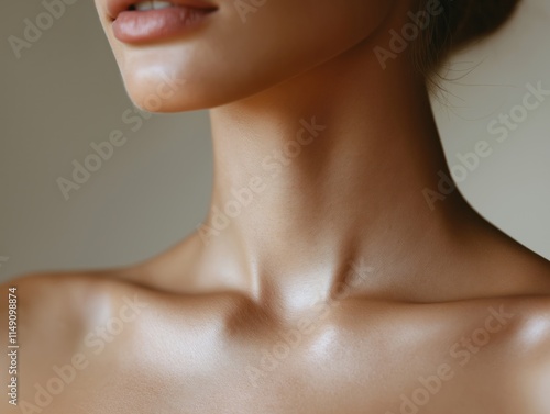 Close-up view of smooth elegant female neck. Natural skin tones, contours highlighted by soft lighting. Photo beauty, grace through details of skin texture, warmth. Natural beauty, intimate focus.
