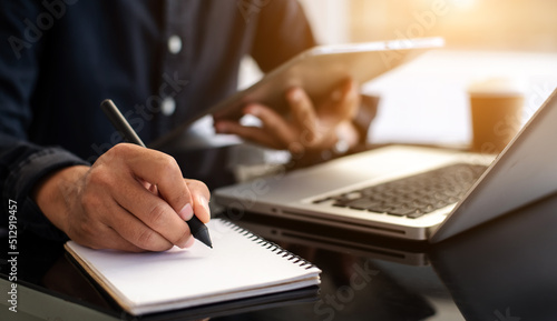 Close-up view of young professional businessman writing his idea concepts on notebook while working on his project at office