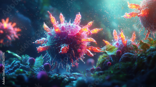 Close-up visualization of a virus attaching to a human cell receptor with intricate protein structures and glowing bio-particles under surreal lighting
