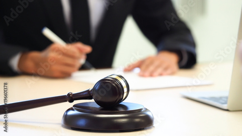 Closeup wooden brown gavel with blurred focus lawyer discussing contract papers or signing contract making a deal on workplace in office background