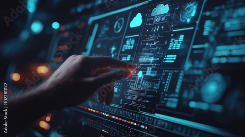 hand, cloud, computing, datum, digital, technology, interface, screen, monitor, futuristic, network, cyber, virtual, information, analysis, program, code, programming, algorithm, web, software, database, system, server, cyberspace, automation, innovation, science, tech, graphic, design, development, blue, dark, glow, artificial, intelligence