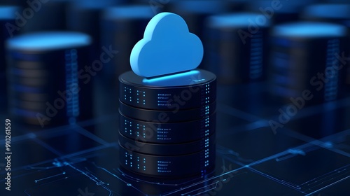 Cloud computing concept with data storage server shown by a blue cloud icon on a stack of database servers in a futuristic setting.