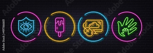 Cloud computing, Eye protection and Ice cream minimal line icons. Neon laser 3d lights. Social responsibility icons. For web, application, printing. Computer storage, Optometry, Sundae stick. Vector