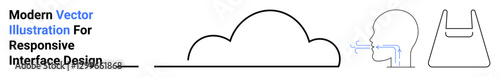 Cloud graphic, silhouette head inhalingexhaling airflow, and bag outline element. Ideal for sustainability, eco-design, cloud computing, wellness, digital interfaces, shopping apps flat landing page