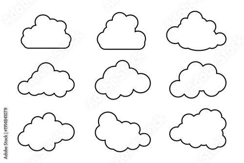 Cloud Shapes collection. Set of Thin Line Cloud Icons. Simple cloud shapes, black outlines. Variety of cloud designs on a grid. Cloud patterns, minimalist cloud art. Weather illustration, vector set.