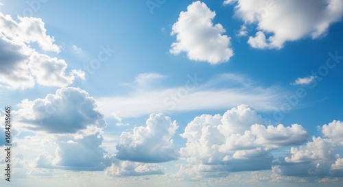 Cloudscape: A pristine canvas of a clear azure sky, adorned with fluffy white clouds. Capturing a sense of tranquility and the boundless expanse of the atmosphere.