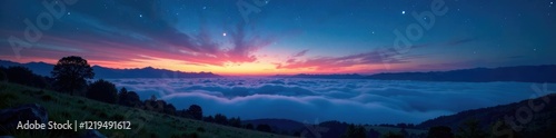 Cloudy evening with starry sky and fog rolling in over the hills, twilight, stars