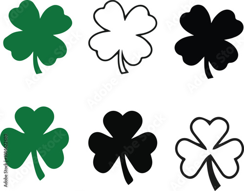 Clover Leaf Vector Icons - Green, Outline, and Black Silhouettes