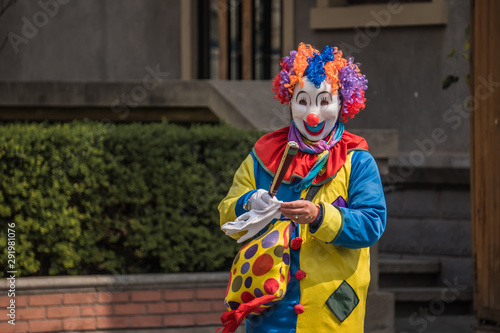 Clown is walking on the street.