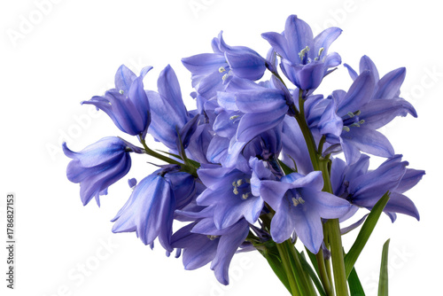 Cluster of delicate bluebell flowers with green stems against a black background floral bloom, Png, Isolated on Transparent Background, Cut Out