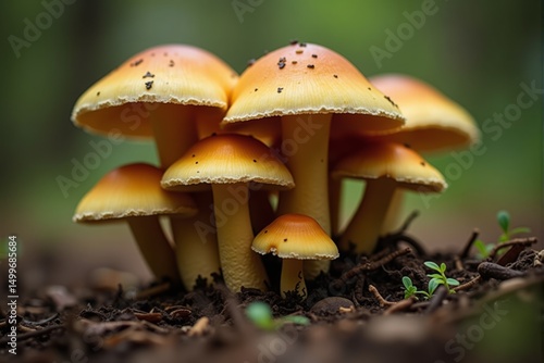 Cluster of small yellow-orange mushrooms naturally emerging from soil against blurred green foliage background mycology study concept