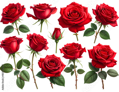 Cluster Set of Red Rose Blooms in Mixed Angles, High Detail Florals, Isolated on Transparent Background