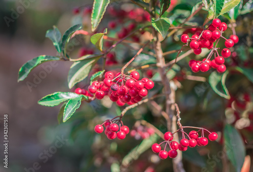 Clusters of ripe red fruits of Hen's eyes, Hilo holly, Christmas berry, Australian holly, Coral ardisia (Ardisia Crenata) on tree in the organic garden