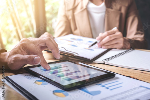 Co working conference, Business team meeting present, investor colleagues discussing new plan financial graph data on office table with laptop and digital tablet, Finance, accounting, investment