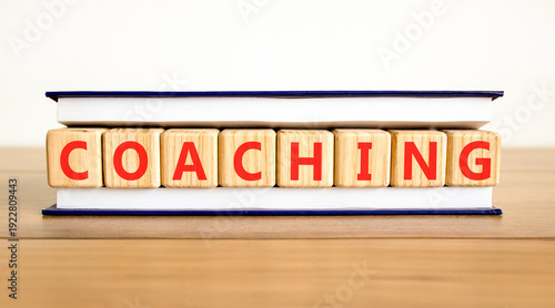 Coaching word symbol. Concept word Coaching on beautiful wooden blocks in beautiful book. Beautiful wooden table white background. Business support help coaching word concept. Copy space.