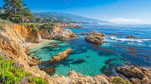 coast, california, cove, turquoise, water, gold, cliff, serene, landscape, ocean, sea, rock, beach, shore, bay, sun, sky, blue, green, nature, photo, scenic, view, travel, vacation, holiday, paradise, idylli, tranquil, calm, peaceful, beautiful, vibrant, picture, image, photo, commercial, tour tourism, escape, relaxation, artwork, art