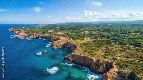 coastal, cliff, ocean, sea, coastline, mediterranean, island, aerial, view, landscape, turquoise, water, blue, sky, sun, vegetation, green, rock, wave, nature, scenic, travel, holiday, vacation, summer, beautiful, panorama, seascape, shore