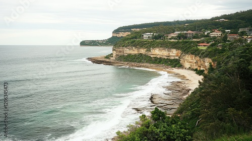 coast, cliff, ocean, wave, house, beach, sand, sea, water, rock, shoreline, landscape, view, scenic, nature, greenery, tree, vegetation, hillside, home, building, architecture, residential, australian, suburb, property, development, dramatic, picturesque, tranquil, serenity, calm, blue, green, grey, sky, cloud, summer, day, sunlight, light, shadow