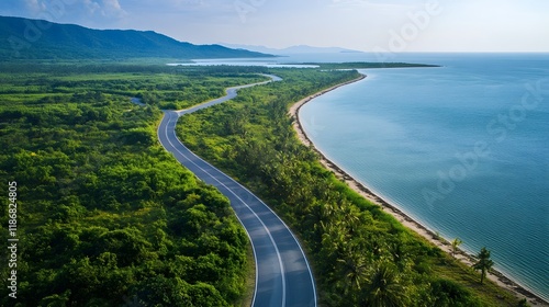 coastal, highway, road, winding, lush, green, landscape, ocean, sea, blue, water, mountain, hill, tree, foliage, vegetation, tropical, paradise, scenic, view, aerial, drone, photo, travel, journey, adventure, nature, summer, sun, sky, horizon, coast, shoreline, beach, palm, sand, asphalt, curve, path, destination