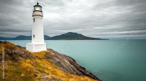 lighthouse, coastal, sea, ocean, island, stormy, beacon, travel, landscape, nature, white, cliff, rock, water, sky, cloud, dramatic, calm, light, hope, guidance, safety, protection, serenity, solitude, peaceful, calmness, view, scenery, seascape, coastline, horizon, wave, blue, green, grey, autumn, fall, photo, image, picture, background