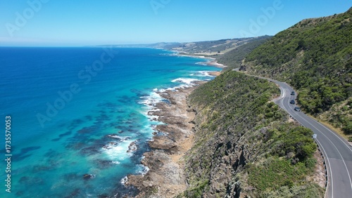 Coastal road on the beautiful ocean coast of Australia. Blue sea and wild coast view from above.