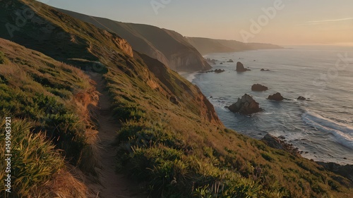 Coastal trail winding along a grassy hillside overlooking the ocean at sunset with rock formations