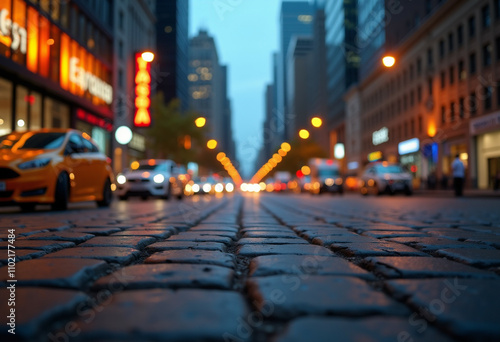 Cobblestone street at dusk city lights blurring in the background creating a dreamy urban scene.