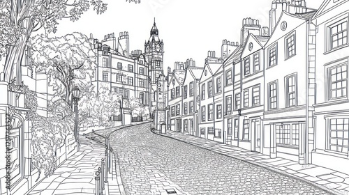 street, cobbled, building, historic, uphill, curve, leafy, background, colouring, page, city, town, architecture, old, vintage, road, lane, alley, pathway, travel, tour tourism, europa, england, scotland, edinburgh, urban, landscape, illustration, drawing, vignetting, design, art, graphic, vector, image, photo, print, book, postcard, wallpaper, pattern