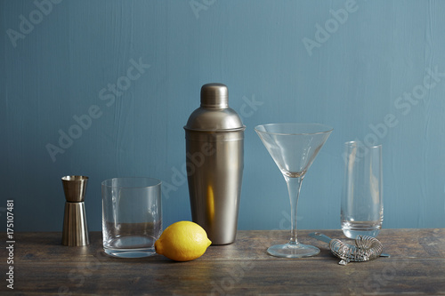 preparing, tool, strainer, shaker, set, old-fashioned, mixing, measurer, making, lemon, horizontal, highball, goggles, glasses, counter, cocktail, barkeeper, bar
