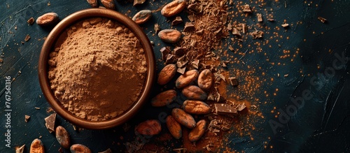 Cocoa and cacao idea illustrated with cocoa powder in a bowl, cocoa beans, and crushed chocolate on a dark surface.