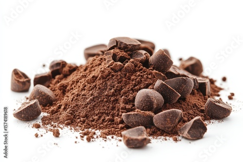 Cocoa powder and dark chocolate pieces. Rich, delicious texture. Ideal for food, baking, and dessert websites.
