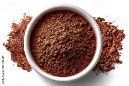 Cocoa Powder in White Bowl: A close-up view of dark brown cocoa powder in a white bowl, showcasing its rich texture and aroma. The powder spills out in a soft mound.