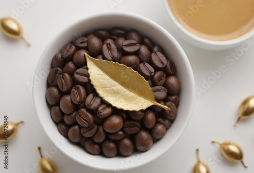 Coffee beans and cup of coffee on white background, top view. AI generated