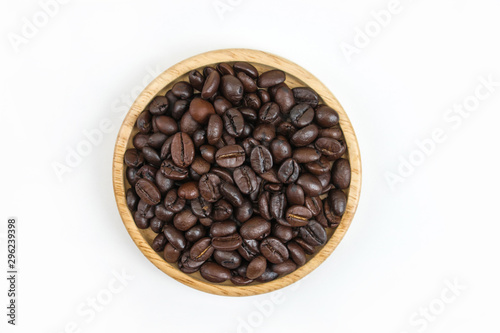 Coffee beans in wood bowl on white background with copy space. Design background