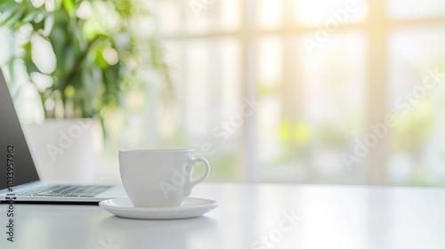 hot drink, cup, laptop, desk, work, office, workspace, workplace, computer, table, white, window, technology, background, break, morning, afternoon, business, home, drink, tea, saucer, hot, beverage, device, modern, minimalism, interior, design, bright, clean, elegant, light, natural, glasses, blur, sharpened