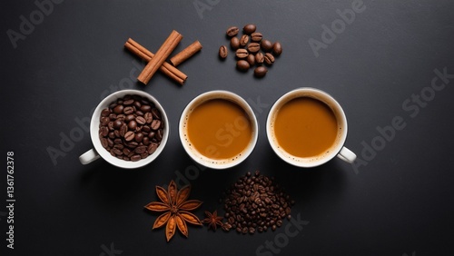 Coffee Cups and Aromatics: Aromatic Coffee Beans, Warm Drinks, Cinnamon Sticks, and Star Anise on a Matte Black Background.