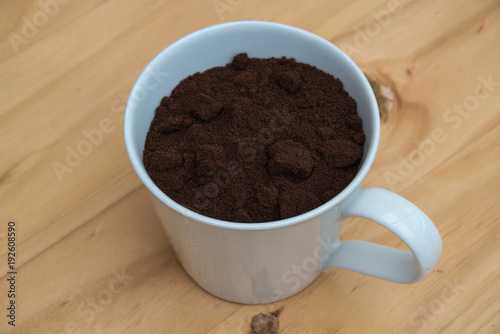 Coffee grounds in a white cup on a wooden table for breakfast