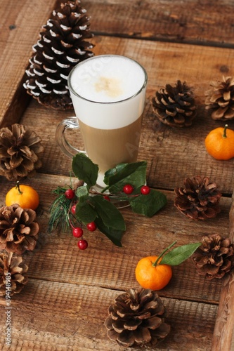 hot drink, latte, forest, cone, table, drink, milk, energy, morning, nature, fruit, breakfast, autumn, winter, christmas, food, cinnamon, cup, decoration, glasses, spice, brown, orange, anise, christmas, apple, beverage, red, chocolate, holiday, sweet, tea