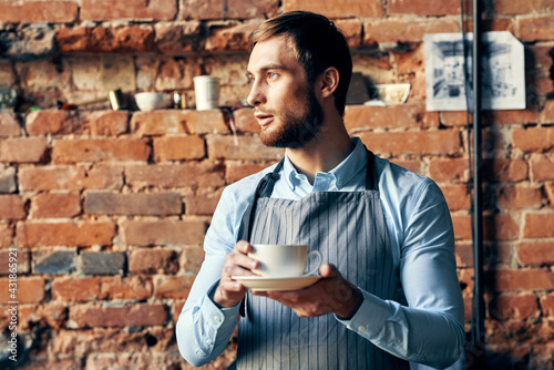 apron, bar, barista, barkeeper, barkeeper, beard, business, cafes, cafeteria, hot drink, concept, counter, cup, client, drink, entrepreneur, photogenic, happy, hipster, hispanic, holding, indoor, job, male, man, middle, owner, people, person, portrait, pos, professional, eatery, service, serving, shop, small, smiling, stall, take-away, waiter, work, men at work, working, young