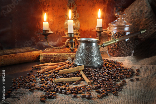 Coffee still life in a retro style by candlelight