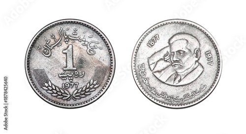 coin, rupee, pakistan, 1, 1977, pakistani, muhammad, arm, alloy, background, banking, cash, change, closeup, macro, currency, emblem, finance, isolated, metal, money, object, obverse, nobody, reverse, symbol, vintage, white, shield, numismatic, commonwealth, round