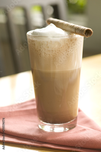 Cold coffee drink with foam and chocolate wafer
