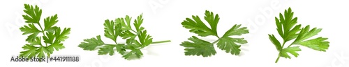 Collage mix of fresh parsley branches isolated on white background. Set of 4 photos of useful greens with vitamins.