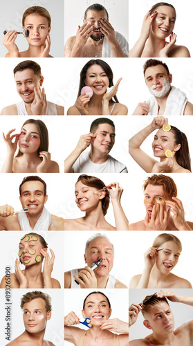 Collage of individuals engaged in various self-care and grooming routines, from washing faces to applying skincare products, Concept of beauty, facial care, cosmetology, antiaging procedures. Ad