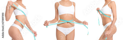 Collage of slim young woman measuring her body with tape on white background, closeup