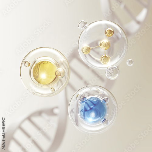 Collagen Serum bubble on Dna Background, cosmetic oil liquid advertising 3d rendering.