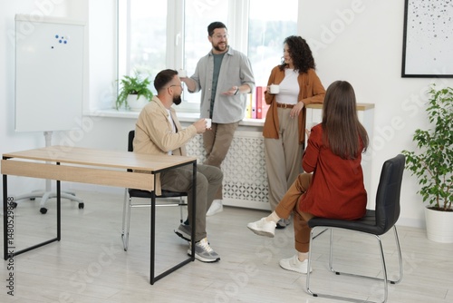 adult, background, bonding, break, business, career, caucasian, chatting, hot drink, colleague, colleague, conversation, co-worker, cup, discussion, drink, employee, enjoy, female, friendly, friendship, group, happy, indoor, job, lifestyle, lunch, male, man, many, meeting, morning, office, people, smiling, table, talking, team, time, together, window, woman, wooden, work, men at work, working, young