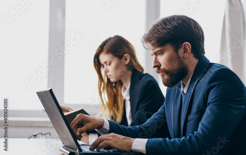 Colleagues in suits at work desk laptop technology team