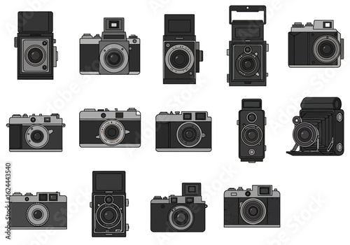Collection of 14 vintage cameras varying shapes and designs arranged on a plain white background