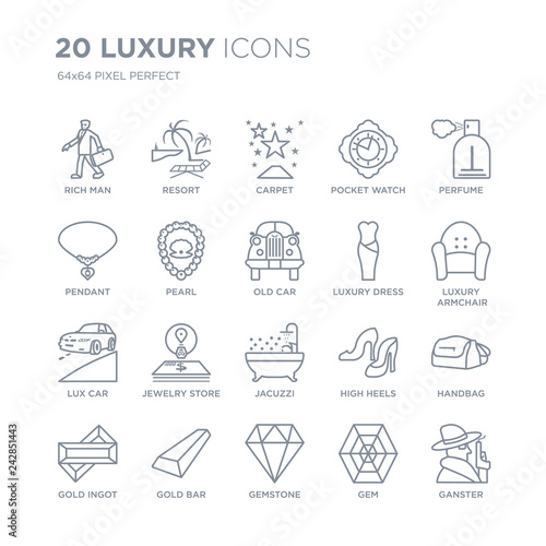 Collection of 20 Luxury linear icons such as Rich man, Resort, Gemstone, Gold bar, ingot, Perfume, luxury Dress, Jacuzzi line icons with thin line stroke, vector illustration of trendy icon set.